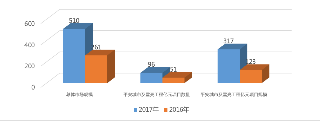 据ca88官网登录平台监测到的大项目数据显示,截止2017年12月底,我国城市视频监控市场中标的大项目累计有1049个,总市场规模达510亿元,较2016年市场规模增长95%。其中包含平安城市和雪亮工程在内的中标过亿元项目有96个,累计市场规模约317亿元;2016年包含平安城市和雪亮工程在内的中标过亿元项目有51项,累计市场规模约123亿元。2017年项目数量较2016年增长88%,市场规模增长158%。其中涉及雪亮工程市场规模约有的中标亿元项目9个,累计市场规模约32亿元。(PS:大项目是指中标金额≧500万元的项目)
