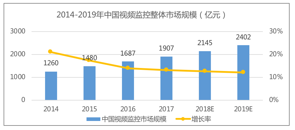 1996年公安部提出科技强警到现在,国内平安城市建设之路已走过20年有余。“科技强警”战略实施以及“3111”试点工程、雪亮工程战略,将中国城市视频监控建设的热潮迅速由试点区域延伸至全国,由公安主导延伸到各部委、各行业主管部门都积极重视。目前,我国城市视频监控建设仍处于全面建设阶段,各省市先后推出众多针对平安城市、雪亮工程等的安防建设项目,大大拉动了安防产业的发展。根据前瞻产业研究院数据,2016年安防行业总产值已达到5,400亿元,同比增长11%,预计2017年市场规模达5,958亿元。按照《中国安防行业“十三五”(2016-2020年)发展规划》,“十三五”期间,中国安防行业将向规模化、联网化、自动化、智能化转型升级,预计到2020年,安防行业总产值将达到8,000亿元,年增长率超过10%。单是视频监控每年的市场规模也不容小窥,如下图,2017年视频监控整体的市场规模1,907亿元,预计2018年将达到2,145亿元。安防项目建设作为智慧城市建设的重要组成部分,将为智慧城市发展打下坚实的基础,而智慧城市的兴起对安防行业也将起到助推作用。