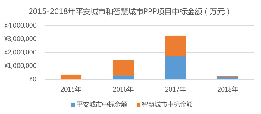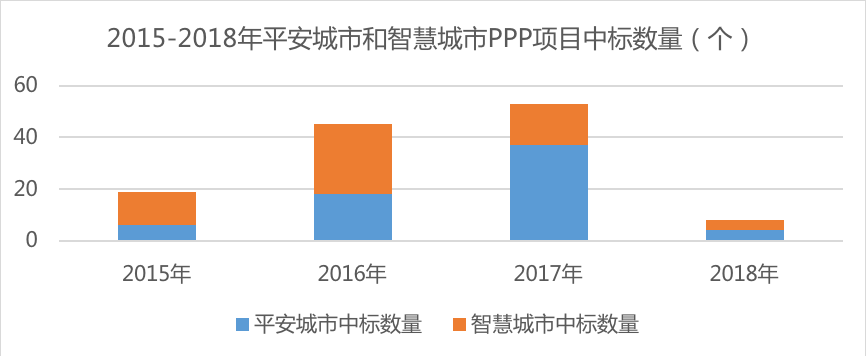 从以上两张图片数据可以看出:从数量上来看2017年平安城市项目比智慧城市类项目多,从中标金额来看,平安城市也比智慧城市略多一些。(2018年数据截止20182月底)。所以说平安城市是智慧城市建设的重要组成部分,也是PPP模式的重要应用场景。